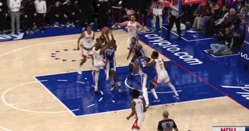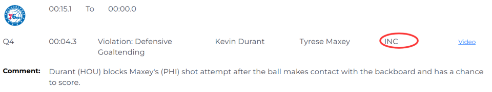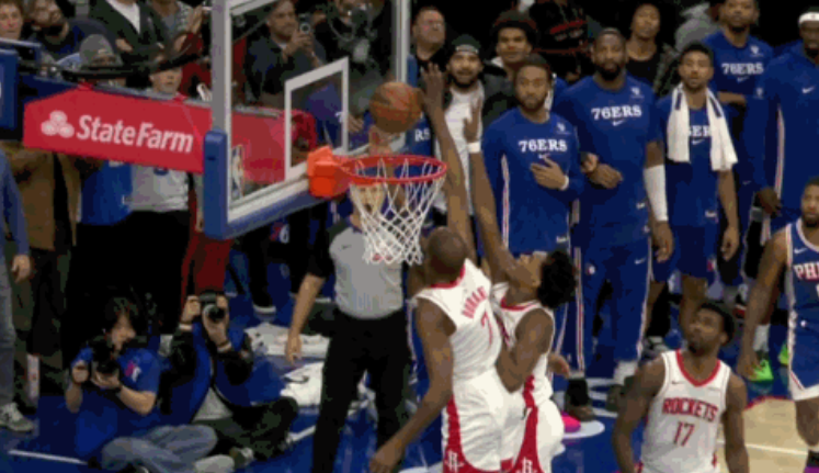 第一次漏判,也是大家第一时间就看到的干扰球违例。距离第四节结束还有4.3秒时,火箭队的杜兰特在76人队马克西的出手篮球打到篮板、仍有入网得分机会时,完成了一记封盖。这是一次漏吹的防守干扰球违例,76人本该得到两分,很有机会在常规时段拿下比赛。这次漏判是76人吃亏,火箭获利。