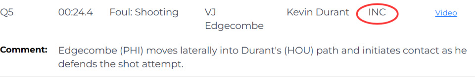 第二次漏判,发生在距离加时赛结束还有24.4秒,76人队的埃奇库姆在防守杜兰特的投篮时,横向移动切入杜兰特的进攻路线,并主动发起了身体接触。这是一次漏吹的投篮犯规,杜兰特将球打进,所以火箭本该获得加罚一球的机会。杜兰特也向裁判摊手表示对方犯规,但裁判没有表示。这次漏判是火箭吃亏,76人获利。